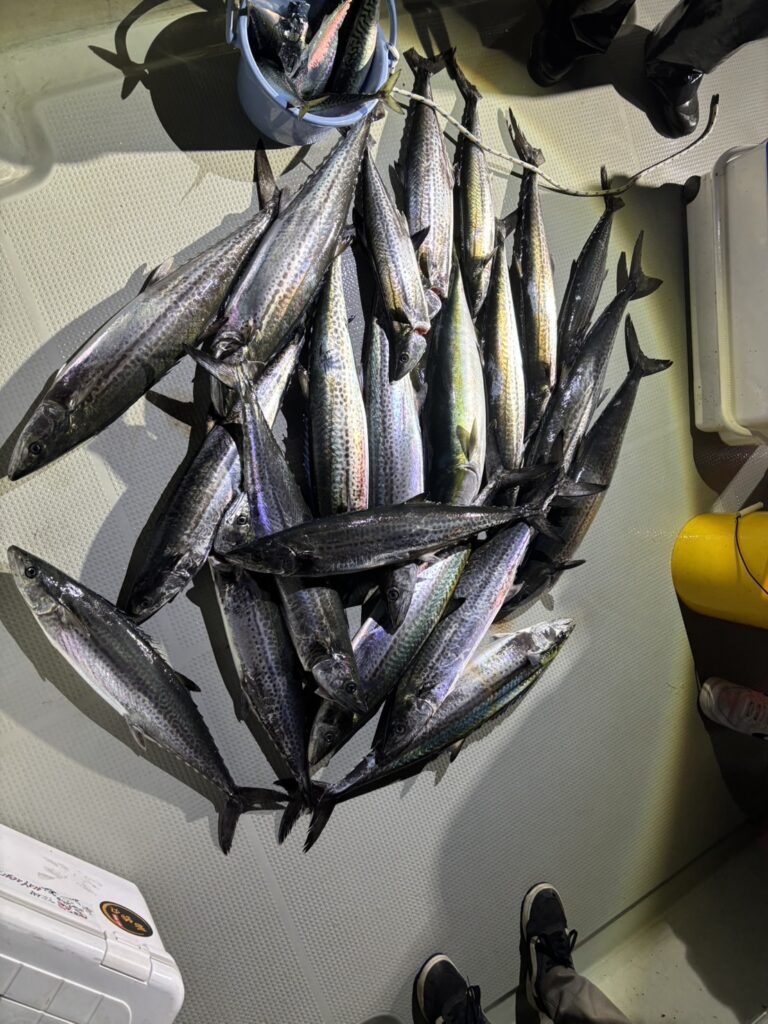 釣果情報 3/19 サワラ便 2026.03.19 今回もゆっくりスタート 開始早々鳥山〜! 追っかけ回すも一本しか取れず、ブレードゲームにシフト 4人ヒットなどもあり、みんなキャッチできました ブツ持ち写真を撮ってる暇なかったので、全体写真だけ